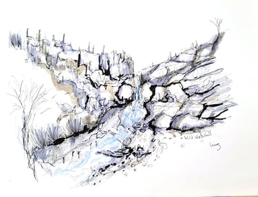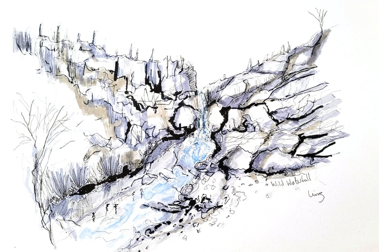 "Wild Waterfall" watercolour and ink urban sketch style